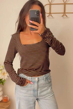 Women's Striped Slim-fit U-neck Long-sleeve Top